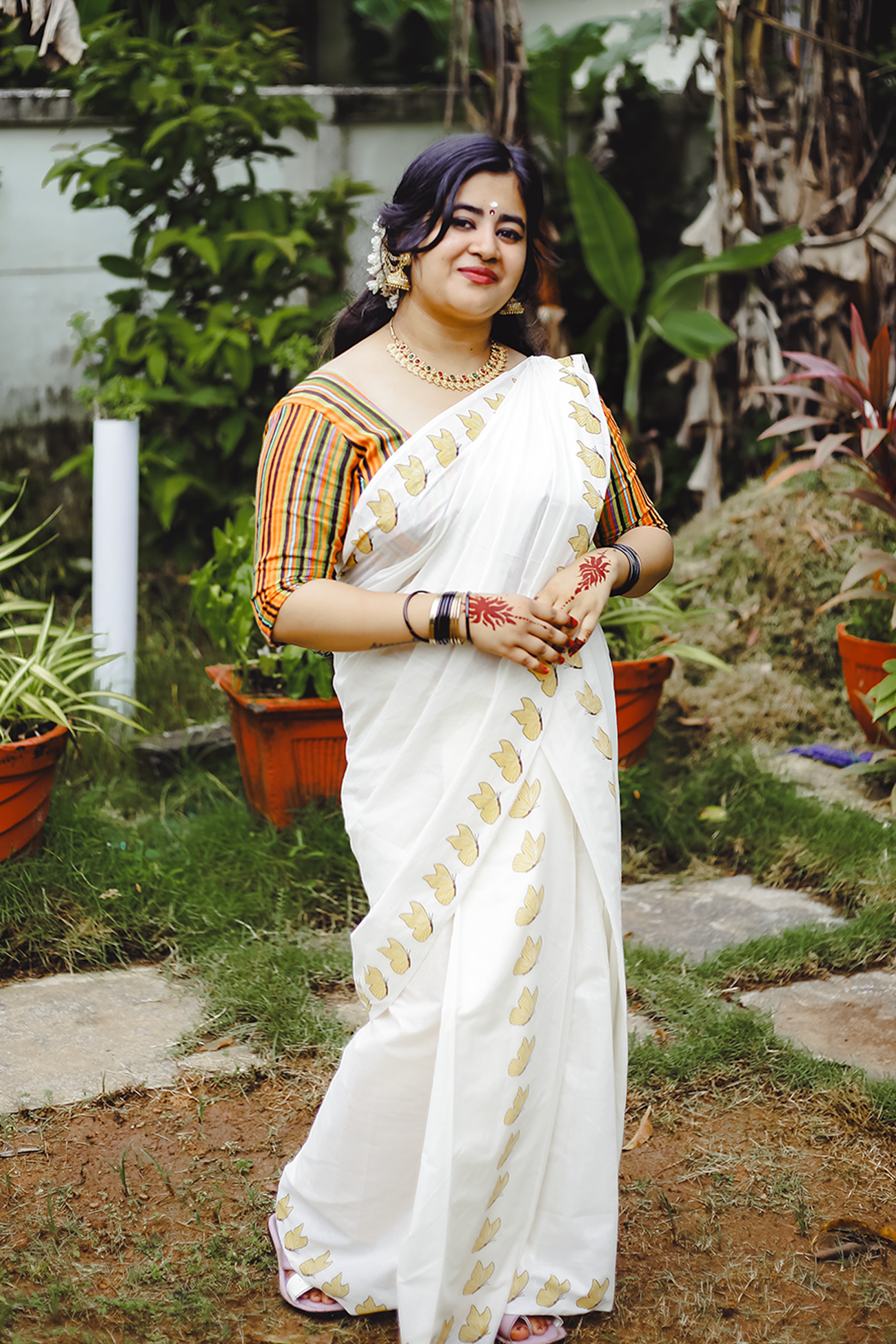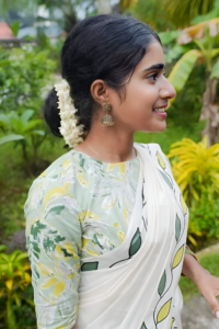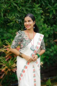 The Butterfly Set Mundu is a premium traditional Kerala outfit crafted from pure cotton, featuring an elegant butterfly print. It comes with a beautifully coordinated printed blouse material, making it perfect for festive and cultural occasions. Designed for all-day comfort, this set mundu offers excellent breathability, a soft texture, and a graceful drape that enhances your traditional look.