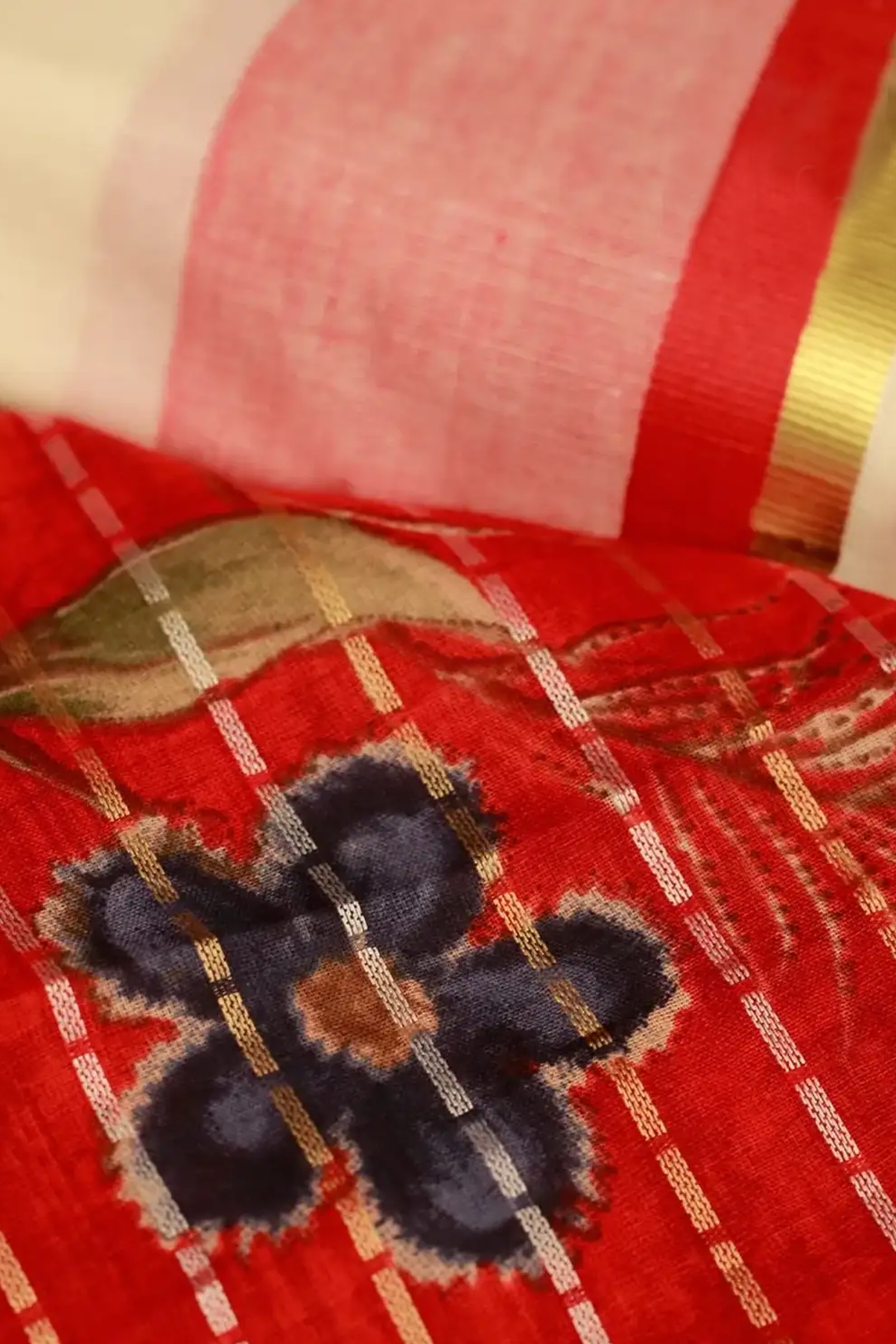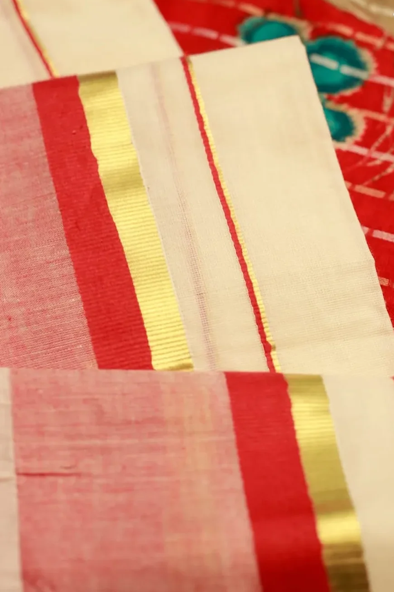 Welcome the divine grace of Kerala into your wardrobe with our stunning Chemboov ensemble. This Kerala traditional set mundu is a beautiful tribute to heritage, reflecting the deep-rooted elegance of Kerala’s vintage tradition.