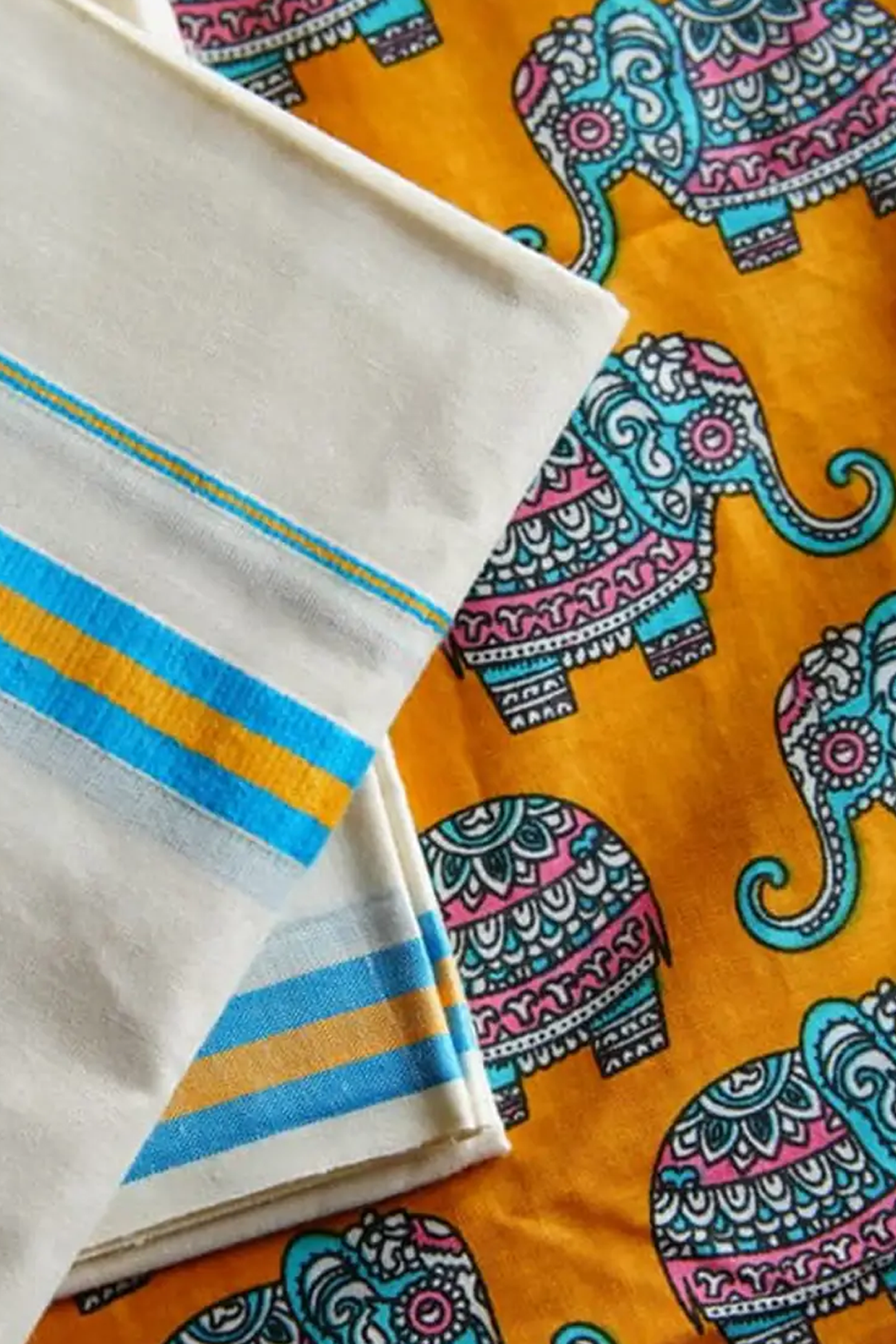 The centerpiece of this unique ensemble is its mesmerizing print. A parade of regal, block-printed style elephants, adorned in vibrant shades of turquoise, fuchsia, and teal, moves across a rich mustard-yellow base. This striking combination captures both the eye and the spirit of celebration.