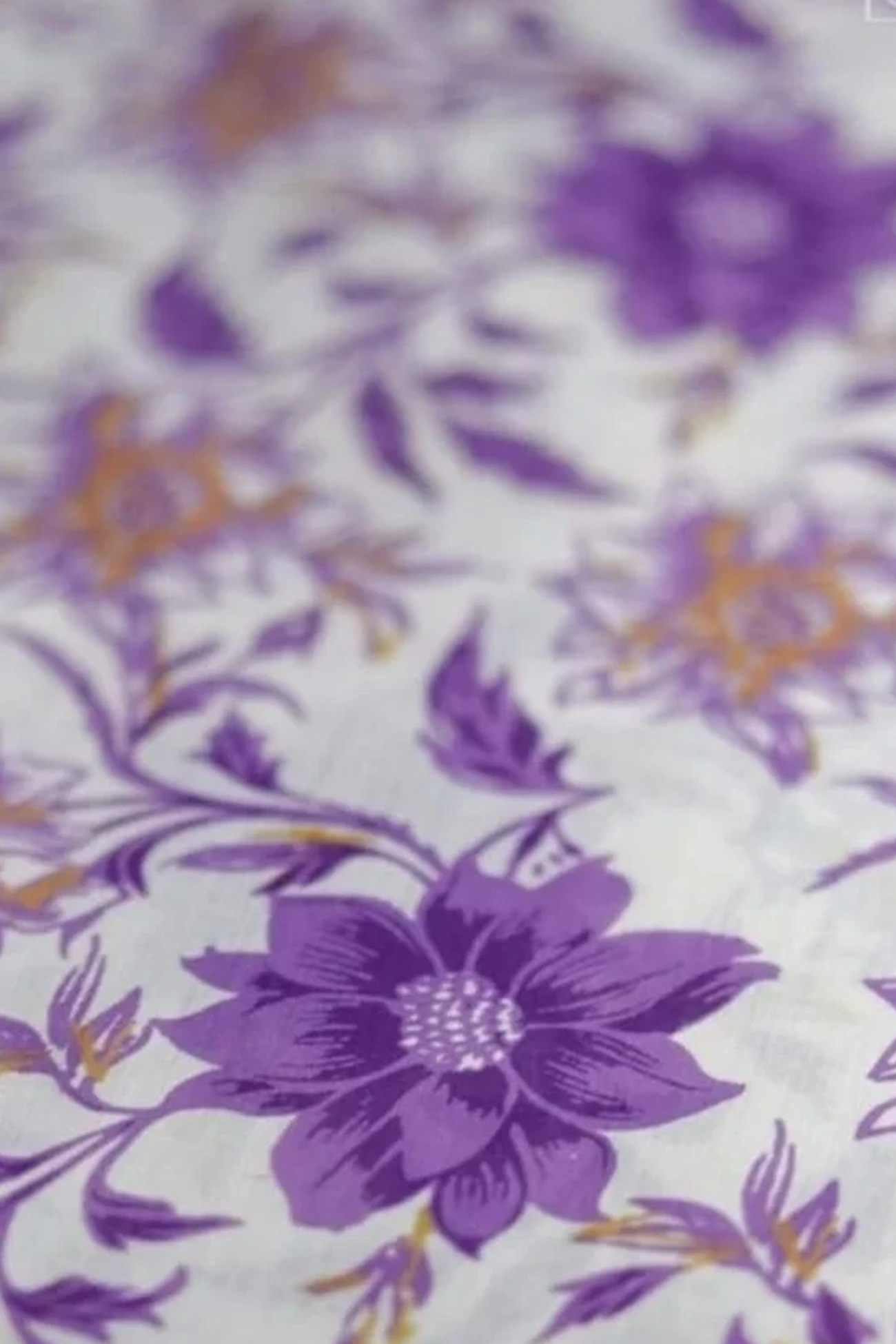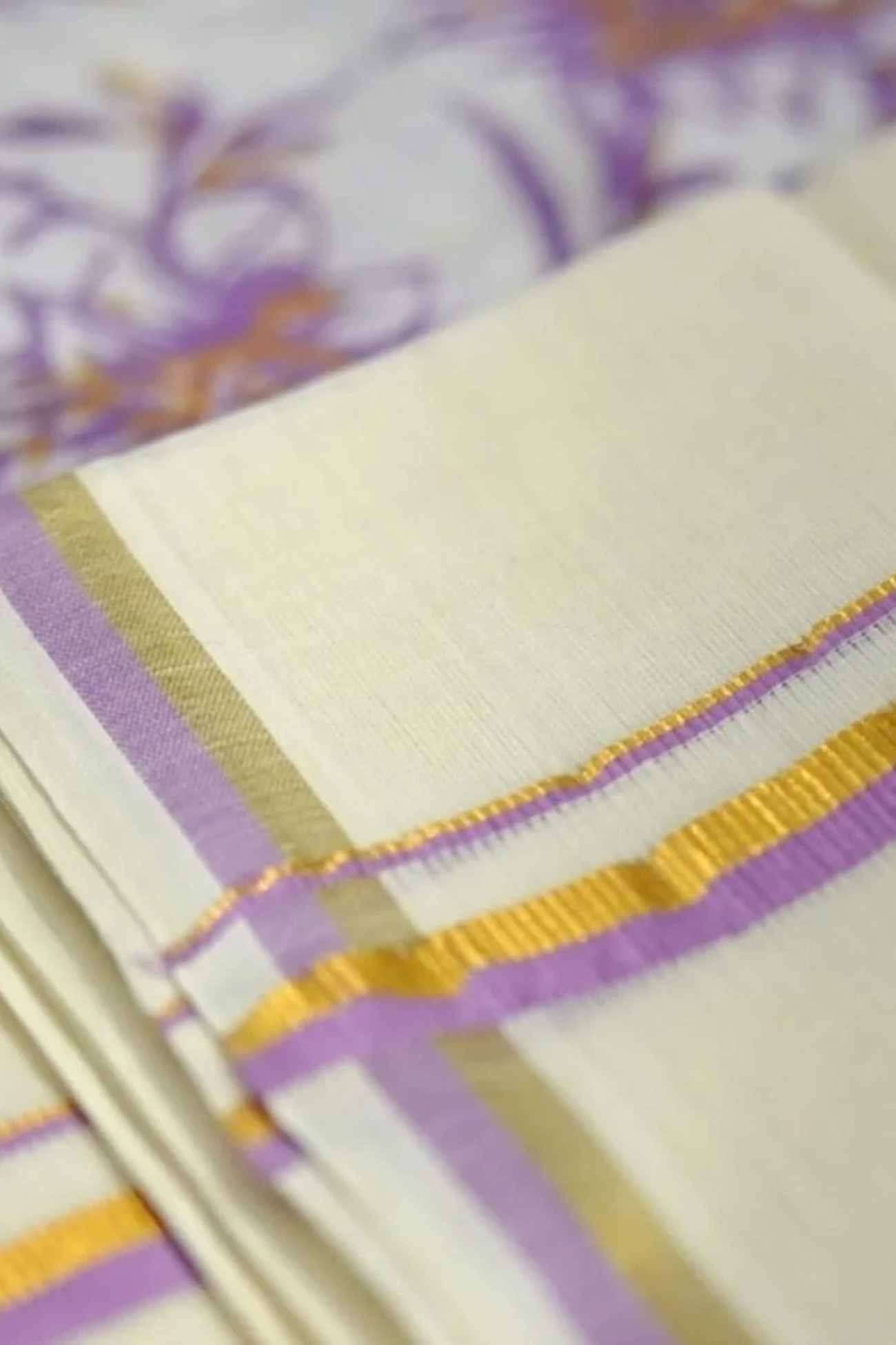 The Vaikha set includes matching unstitched printed blouse material, ensuring a perfectly coordinated outfit. The blouse fabric features an intricate floral print in purple, off-white, and gold tones, beautifully complementing the design of the mundu.